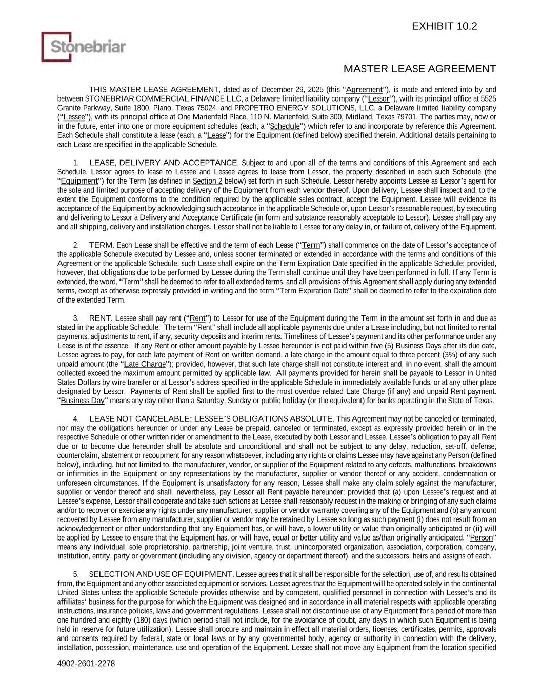 MASTER LEASE AGREEMENT 4902-2601-2278 THIS MASTER LEASE AGREEMENT, dated as of December 29, 2025 (this “Agreement”), is made and entered into by and between STONEBRIAR COMMERCIAL FINANCE LLC, a Delaware limited liability company (“Lessor”), with its principal office at 5525 Granite Parkway, Suite 1800, Plano, Texas 75024, and PROPETRO ENERGY SOLUTIONS, LLC, a Delaware limited liability company (“Lessee”), with its principal office at One Marienfeld Place, 110 N. Marienfeld, Suite 300, Midland, Texas 79701. The parties may, now or in the future, enter into one or more equipment schedules (each, a “Schedule”) which refer to and incorporate by reference this Agreement. Each Schedule shall constitute a lease (each, a “Lease”) for the Equipment (defined below) specified therein. Additional details pertaining to each Lease are specified in the applicable Schedule. 1. LEASE, DELIVERY AND ACCEPTANCE. Subject to and upon all of the terms and conditions of this Agreement and each Schedule, Lessor agrees to lease to Lessee and Lessee agrees to lease from Lessor, the property described in each such Schedule (the “Equipment”) for the Term (as defined in Section 2 below) set forth in such Schedule. Lessor hereby appoints Lessee as Lessor’s agent for the sole and limited purpose of accepting delivery of the Equipment from each vendor thereof. Upon delivery, Lessee shall inspect and, to the extent the Equipment conforms to the condition required by the applicable sales contract, accept the Equipment. Lessee will evidence its acceptance of the Equipment by acknowledging such acceptance in the applicable Schedule or, upon Lessor’s reasonable request, by executing and delivering to Lessor a Delivery and Acceptance Certificate (in form and substance reasonably acceptable to Lessor). Lessee shall pay any and all shipping, delivery and installation charges. Lessor shall not be liable to Lessee for any delay in, or failure of, delivery of the Equipment. 2. TERM. Each Lease shall be effective and the term of each Lease (“Term”) shall commence on the date of Lessor’s acceptance of the applicable Schedule executed by Lessee and, unless sooner terminated or extended in accordance with the terms and conditions of this Agreement or the applicable Schedule, such Lease shall expire on the Term Expiration Date specified in the applicable Schedule; provided, however, that obligations due to be performed by Lessee during the Term shall continue until they have been performed in full. If any Term is extended, the word, “Term” shall be deemed to refer to all extended terms, and all provisions of this Agreement shall apply during any extended terms, except as otherwise expressly provided in writing and the term “Term Expiration Date” shall be deemed to refer to the expiration date of the extended Term. 3. RENT. Lessee shall pay rent (“Rent”) to Lessor for use of the Equipment during the Term in the amount set forth in and due as stated in the applicable Schedule. The term “Rent” shall include all applicable payments due under a Lease including, but not limited to rental payments, adjustments to rent, if any, security deposits and interim rents. Timeliness of Lessee’s payment and its other performance under any Lease is of the essence. If any Rent or other amount payable by Lessee hereunder is not paid within five (5) Business Days after its due date, Lessee agrees to pay, for each late payment of Rent on written demand, a late charge in the amount equal to three percent (3%) of any such unpaid amount (the “Late Charge”); provided, however, that such late charge shall not constitute interest and, in no event, shall the amount collected exceed the maximum amount permitted by applicable law. All payments provided for herein shall be payable to Lessor in United States Dollars by wire transfer or at Lessor’s address specified in the applicable Schedule in immediately available funds, or at any other place designated by Lessor. Payments of Rent shall be applied first to the most overdue related Late Charge (if any) and unpaid Rent payment. “Business Day” means any day other than a Saturday, Sunday or public holiday (or the equivalent) for banks operating in the State of Texas. 4. LEASE NOT CANCELABLE; LESSEE’S OBLIGATIONS ABSOLUTE. This Agreement may not be canceled or terminated, nor may the obligations hereunder or under any Lease be prepaid, canceled or terminated, except as expressly provided herein or in the respective Schedule or other written rider or amendment to the Lease, executed by both Lessor and Lessee. Lessee’s obligation to pay all Rent due or to become due hereunder shall be absolute and unconditional and shall not be subject to any delay, reduction, set-off, defense, counterclaim, abatement or recoupment for any reason whatsoever, including any rights or claims Lessee may have against any Person (defined below), including, but not limited to, the manufacturer, vendor, or supplier of the Equipment related to any defects, malfunctions, breakdowns or infirmities in the Equipment or any representations by the manufacturer, supplier or vendor thereof or any accident, condemnation or unforeseen circumstances. If the Equipment is unsatisfactory for any reason, Lessee shall make any claim solely against the manufacturer, supplier or vendor thereof and shall, nevertheless, pay Lessor all Rent payable hereunder; provided that (a) upon Lessee’s request and at Lessee’s expense, Lessor shall cooperate and take such actions as Lessee shall reasonably request in the making or bringing of any such claims and/or to recover or exercise any rights under any manufacturer, supplier or vendor warranty covering any of the Equipment and (b) any amount recovered by Lessee from any manufacturer, supplier or vendor may be retained by Lessee so long as such payment (i) does not result from an acknowledgement or other understanding that any Equipment has, or will have, a 