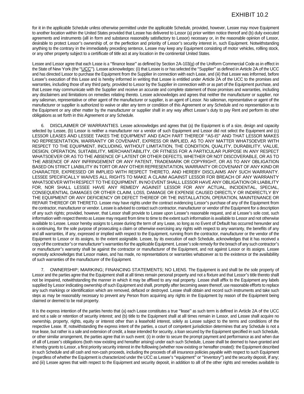 for it in the applicable Schedule unless otherwise permitted under the applicable Schedule, provided, however, Lessee may move Equipment to another location within the United States provided that Lessee has delivered to Lessor (a) prior written notice thereof and (b) duly executed agreements and instruments (all in form and substance reasonably satisfactory to Lessor) necessary or, in the reasonable opinion of Lessor, desirable to protect Lessor’s ownership of, or the perfection and priority of Lessor’s security interest in, such Equipment. Notwithstanding anything to the contrary in the immediately preceding sentence, Lessee may keep any Equipment consisting of motor vehicles, rolling stock, or any other property subject to a certificate of title act at any location in the continental United States. Lessee and Lessor agree that each Lease is a “finance lease” as defined by Section 2A-103(g) of the Uniform Commercial Code as in effect in the State of New York (the “UCC”). Lessee acknowledges: (i) that Lessee is or has selected the “Supplier” as defined in Article 2A of the UCC and has directed Lessor to purchase the Equipment from the Supplier in connection with each Lease, and (ii) that Lessee was informed, before Lessee’s execution of this Lease and is hereby informed in writing that Lessee is entitled under Article 2A of the UCC to the promises and warranties, including those of any third party, provided to Lessor by the Supplier in connection with or as part of the Equipment purchase, and that Lessee may communicate with the Supplier and receive an accurate and complete statement of those promises and warranties, including any disclaimers and limitations on remedies relating thereto. Lessee acknowledges and agrees that neither the manufacturer or supplier, nor any salesman, representative or other agent of the manufacturer or supplier, is an agent of Lessor. No salesman, representative or agent of the manufacturer or supplier is authorized to waive or alter any term or condition of this Agreement or any Schedule and no representation as to the Equipment or any other matter by the manufacturer or supplier shall in any way affect Lessee’s duty to pay Rent and perform its other obligations as set forth in this Agreement or any Schedule. 6. DISCLAIMER OF WARRANTIES. Lessee acknowledges and agrees that (a) the Equipment is of a size, design and capacity selected by Lessee, (b) Lessor is neither a manufacturer nor a vendor of such Equipment and Lessor did not select the Equipment and (c) LESSOR LEASES AND LESSEE TAKES THE EQUIPMENT AND EACH PART THEREOF “AS-IS” AND THAT LESSOR MAKES NO REPRESENTATION, WARRANTY OR COVENANT, EXPRESS OR IMPLIED, AS TO ANY MATTER WHATSOEVER WITH RESPECT TO THE EQUIPMENT, INCLUDING, WITHOUT LIMITATION, THE CONDITION, QUALITY, DURABILITY, VALUE, DESIGN, OPERATION, SUITABILITY, MERCHANTABILITY, OR FITNESS FOR A PARTICULAR PURPOSE IN ANY RESPECT WHATSOEVER OR AS TO THE ABSENCE OF LATENT OR OTHER DEFECTS, WHETHER OR NOT DISCOVERABLE, OR AS TO THE ABSENCE OF ANY INFRINGEMENT OR ANY PATENT, TRADEMARK OR COPYRIGHT, OR AS TO ANY OBLIGATION BASED ON STRICT LIABILITY IN TORT OR ANY OTHER REPRESENTATION, WARRANTY OR COVENANT OF ANY KIND OR CHARACTER, EXPRESSED OR IMPLIED WITH RESPECT THERETO, AND HEREBY DISCLAIMS ANY SUCH WARRANTY. LESSEE SPECIFICALLY WAIVES ALL RIGHTS TO MAKE A CLAIM AGAINST LESSOR FOR BREACH OF ANY WARRANTY WHATSOEVER WITH RESPECT TO THE EQUIPMENT. IN NO EVENT SHALL LESSOR HAVE ANY OBLIGATION OR LIABILITY FOR, NOR SHALL LESSEE HAVE ANY REMEDY AGAINST LESSOR FOR ANY ACTUAL, INCIDENTAL, SPECIAL, CONSEQUENTIAL DAMAGES OR OTHER CLAIM, LOSS, DAMAGE OR EXPENSE CAUSED DIRECTLY OR INDIRECTLY BY THE EQUIPMENT OR ANY DEFICIENCY OR DEFECT THEREOF OR THE INSTALLATION, OPERATION, MAINTENANCE OR REPAIR THEREOF OR THERETO. Lessee may have rights under the contract evidencing Lessor’s purchase of any of the Equipment from the contractor, manufacturer or vendor. Lessee is advised to contact such contractor, manufacturer or vendor of the Equipment for a description of any such rights; provided, however, that Lessor shall provide to Lessee upon Lessee’s reasonable request, and at Lessee’s sole cost, such information with respect thereto as Lessee may request from time to time to the extent such information is available to Lessor and not otherwise available to Lessee. Lessor hereby assigns to Lessee during the term of any Lease, so long as no Event of Default has occurred hereunder and is continuing, for the sole purpose of prosecuting a claim or otherwise exercising any rights with respect to any warranty, the benefits of any and all warranties, if any, expressed or implied with respect to the Equipment, running from the contractor, manufacturer or the vendor of the Equipment to Lessor or its assigns, to the extent assignable. Lessee, by its execution of each Schedule, acknowledges that it has received a copy of the contractor’s or manufacturer’s warranties for the applicable Equipment. Lessee’s sole remedy for the breach of any such contractor’s or manufacturer’s warranty shall be against the contractor or manufacturer of the Equipment, and not against Lessor or its assigns. Lessee expressly acknowledges that Lessor makes, and has made, no representations or warranties whatsoever as to the existence or the availability of such warranties of the manufacturer of the Equipment. 7. OWNERSHIP; MARKING; FINANCING STATEMENTS; NO LIENS. The Equipment is and shall be the sole property of Lessor and the parties agree that the Equipment shall at all times remain personal property and not a fixture and that Lessor’s title thereto shall not be impaired, notwithstanding the manner in which it may be affixed to any real property. Lessee shall affix to the Equipment any labels supplied by Lessor indicating ownership of such Equipment and shall, promptly after becoming aware thereof, use reasonable efforts to replace any such markings or identifi