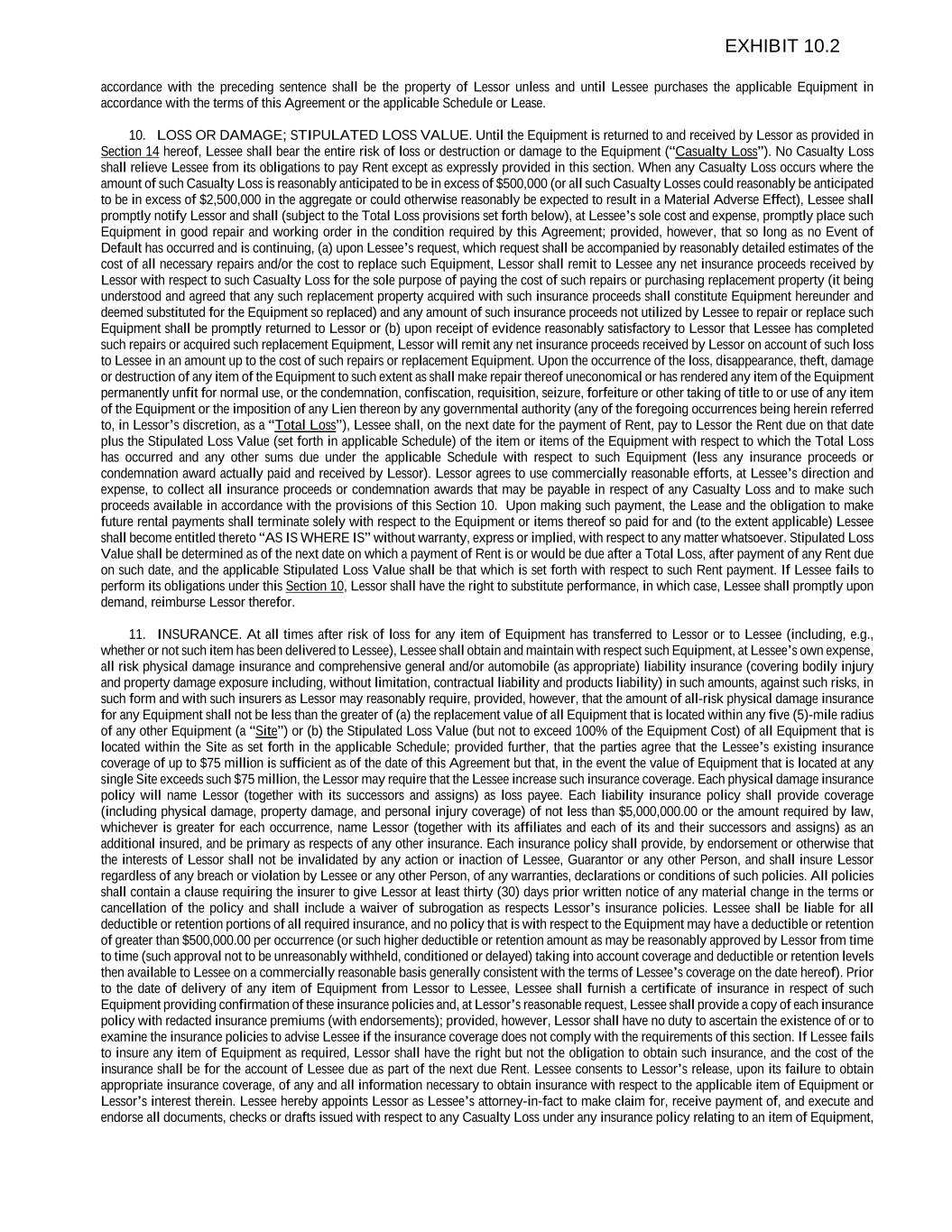 accordance with the preceding sentence shall be the property of Lessor unless and until Lessee purchases the applicable Equipment in accordance with the terms of this Agreement or the applicable Schedule or Lease. 10. LOSS OR DAMAGE; STIPULATED LOSS VALUE. Until the Equipment is returned to and received by Lessor as provided in Section 14 hereof, Lessee shall bear the entire risk of loss or destruction or damage to the Equipment (“Casualty Loss”). No Casualty Loss shall relieve Lessee from its obligations to pay Rent except as expressly provided in this section. When any Casualty Loss occurs where the amount of such Casualty Loss is reasonably anticipated to be in excess of $500,000 (or all such Casualty Losses could reasonably be anticipated to be in excess of $2,500,000 in the aggregate or could otherwise reasonably be expected to result in a Material Adverse Effect), Lessee shall promptly notify Lessor and shall (subject to the Total Loss provisions set forth below), at Lessee’s sole cost and expense, promptly place such Equipment in good repair and working order in the condition required by this Agreement; provided, however, that so long as no Event of Default has occurred and is continuing, (a) upon Lessee’s request, which request shall be accompanied by reasonably detailed estimates of the cost of all necessary repairs and/or the cost to replace such Equipment, Lessor shall remit to Lessee any net insurance proceeds received by Lessor with respect to such Casualty Loss for the sole purpose of paying the cost of such repairs or purchasing replacement property (it being understood and agreed that any such replacement property acquired with such insurance proceeds shall constitute Equipment hereunder and deemed substituted for the Equipment so replaced) and any amount of such insurance proceeds not utilized by Lessee to repair or replace such Equipment shall be promptly returned to Lessor or (b) upon receipt of evidence reasonably satisfactory to Lessor that Lessee has completed such repairs or acquired such replacement Equipment, Lessor will remit any net insurance proceeds received by Lessor on account of such loss to Lessee in an amount up to the cost of such repairs or replacement Equipment. Upon the occurrence of the loss, disappearance, theft, damage or destruction of any item of the Equipment to such extent as shall make repair thereof uneconomical or has rendered any item of the Equipment permanently unfit for normal use, or the condemnation, confiscation, requisition, seizure, forfeiture or other taking of title to or use of any item of the Equipment or the imposition of any Lien thereon by any governmental authority (any of the foregoing occurrences being herein referred to, in Lessor’s discretion, as a “Total Loss”), Lessee shall, on the next date for the payment of Rent, pay to Lessor the Rent due on that date plus the Stipulated Loss Value (set forth in applicable Schedule) of the item or items of the Equipment with respect to which the Total Loss has occurred and any other sums due under the applicable Schedule with respect to such Equipment (less any insurance proceeds or condemnation award actually paid and received by Lessor). Lessor agrees to use commercially reasonable efforts, at Lessee’s direction and expense, to collect all insurance proceeds or condemnation awards that may be payable in respect of any Casualty Loss and to make such proceeds available in accordance with the provisions of this Section 10. Upon making such payment, the Lease and the obligation to make future rental payments shall terminate solely with respect to the Equipment or items thereof so paid for and (to the extent applicable) Lessee shall become entitled thereto “AS IS WHERE IS” without warranty, express or implied, with respect to any matter whatsoever. Stipulated Loss Value shall be determined as of the next date on which a payment of Rent is or would be due after a Total Loss, after payment of any Rent due on such date, and the applicable Stipulated Loss Value shall be that which is set forth with respect to such Rent payment. If Lessee fails to perform its obligations under this Section 10, Lessor shall have the right to substitute performance, in which case, Lessee shall promptly upon demand, reimburse Lessor therefor. 11. INSURANCE. At all times after risk of loss for any item of Equipment has transferred to Lessor or to Lessee (including, e.g., whether or not such item has been delivered to Lessee), Lessee shall obtain and maintain with respect such Equipment, at Lessee’s own expense, all risk physical damage insurance and comprehensive general and/or automobile (as appropriate) liability insurance (covering bodily injury and property damage exposure including, without limitation, contractual liability and products liability) in such amounts, against such risks, in such form and with such insurers as Lessor may reasonably require, provided, however, that the amount of all-risk physical damage insurance for any Equipment shall not be less than the greater of (a) the replacement value of all Equipment that is located within any five (5)-mile radius of any other Equipment (a “Site”) or (b) the Stipulated Loss Value (but not to exceed 100% of the Equipment Cost) of all Equipment that is located within the Site as set forth in the applicable Schedule; provided further, that the parties agree that the Lessee’s existing insurance coverage of up to $75 million is sufficient as of the date of this Agreement but that, in the event the value of Equipment that is located at any single Site exceeds such $75 million, the Lessor may require that the Lessee increase such insurance coverage. Each physical damage insurance policy will name Lessor (together with its successors and assigns) as loss payee. Each liability insurance policy shall provide coverage (including physical damage, property damage, and personal injury coverage) of not less than $5,000,000.00 or the amou