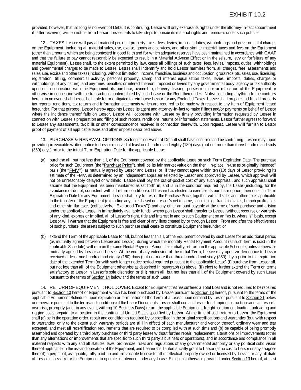provided, however, that, so long as no Event of Default is continuing, Lessor will only exercise its rights under the attorney-in-fact appointment if, after receiving written notice from Lessor, Lessee fails to take steps to pursue its material rights and remedies under such policies. 12. TAXES. Lessee will pay all material personal property taxes, fees, levies, imposts, duties, withholdings and governmental charges on the Equipment, including all material sales, use, excise, goods and services, and other similar material taxes and fees on the Equipment (other than amounts which are being contested in good faith and for which adequate reserves have been maintained in accordance with GAAP and that the failure to pay cannot reasonably be expected to result in a Material Adverse Effect or in the seizure, levy or forfeiture of any material Equipment). Lessee shall, to the extent permitted by law, cause all billings of such taxes, fees, levies, imposts, duties, withholdings and governmental charges to be made to Lessee. Lessee shall indemnify and hold Lessor harmless from, all charges, fees, assessments and sales, use, excise and other taxes (including, without limitation, income, franchise, business and occupation, gross receipts, sales, use, licensing, registration, titling, commercial activity, personal property, stamp and interest equalization taxes, levies, imposts, duties, charges or withholdings of any nature), and any fines, penalties or interest thereon, imposed or levied by any governmental body, agency or tax authority upon or in connection with the Equipment, its purchase, ownership, delivery, leasing, possession, use or relocation of the Equipment or otherwise in connection with the transactions contemplated by each Lease or the Rent thereunder. Notwithstanding anything to the contrary herein, in no event shall Lessee be liable for or obligated to reimburse Lessor for any Excluded Taxes. Lessee shall prepare and file all property tax reports, renditions, tax returns and information statements which are required to be made with respect to any item of Equipment leased hereunder. For that purpose, Lessor hereby appoints Lessee its agent and attorney-in-fact to make filings and/or payments on behalf of Lessor where the incidence thereof falls on Lessor. Lessor will cooperate with Lessee by timely providing information requested by Lessee in connection with Lessee’s preparation and filing of such reports, renditions, returns or information statements. Lessor further agrees to forward to Lessee any assessments, tax bills or other correspondence received in connection therewith. Upon request, Lessee will furnish to Lessor proof of payment of all applicable taxes and other imposts described above. 13. PURCHASE & RENEWAL OPTIONS. So long as no Event of Default shall have occurred and be continuing, Lessee may, upon providing irrevocable written notice to Lessor received at least one hundred and eighty (180) days (but not more than three-hundred and sixty (360) days) prior to the initial Term Expiration Date for the applicable Lease: (a) purchase all, but not less than all, of the Equipment covered by the applicable Lease on such Term Expiration Date. The purchase price for such Equipment (the “Purchase Price”), shall be its fair market value on the then “in-place, in-use as originally intended” basis (the “FMV”), as mutually agreed by Lessor and Lessee, or, if they cannot agree within ten (10) days of Lessor providing its estimate of the FMV, as determined by an independent appraiser selected by Lessor and approved by Lessee, which approval will not be unreasonably delayed or withheld. Lessee shall pay the out-of-pocket cost of any such appraisal, and such appraisal shall assume that the Equipment has been maintained as set forth in, and is in the condition required by, the Lease (including, for the avoidance of doubt, consistent with all return conditions). If Lessee has elected to exercise its purchase option, then on such Term Expiration Date for any Equipment, Lessee shall pay to Lessor the Purchase Price, together with all sales and other taxes applicable to the transfer of the Equipment (excluding any taxes based on Lessor’s net income, such as, e.g., franchise taxes, branch profit taxes and other similar taxes (collectively, “Excluded Taxes”)) and any other amount payable at the time of such purchase and arising under the applicable Lease, in immediately available funds, whereupon Lessor shall transfer to Lessee, without recourse or warranty of any kind, express or implied, all of Lessor’s right, title and interest in and to such Equipment on an “as is, where is” basis, except Lessor will warrant that the Equipment is free and clear of any liens created by or through Lessor. From and after the effectiveness of such purchase, the assets subject to such purchase shall cease to constitute Equipment hereunder; or (b) extend the Term of the applicable Lease for all, but not less than all, of the Equipment covered by such Lease for an additional period (as mutually agreed between Lessee and Lessor), during which the monthly Rental Payment Amount (as such term is used in the applicable Schedule) will remain the same Rental Payment Amount as initially set forth in the applicable Schedule, unless otherwise mutually agreed by Lessor and Lessee. At the end of any extension of the initial Term, Lessee may upon written notice to Lessor received at least one hundred and eighty (180) days (but not more than three hundred and sixty (360) days) prior to the expiration date of the extended Term (or with such longer notice period required pursuant to the applicable Lease) (i) purchase from Lessor all, but not less than all, of the Equipment otherwise as described in paragraph (a) above, (ii) elect to further extend the Term on terms satisfactory to Lessor in Lessor’s sole discretion or (iii) return all, but not less than all, of the Equipment covered by such Lease pursuant