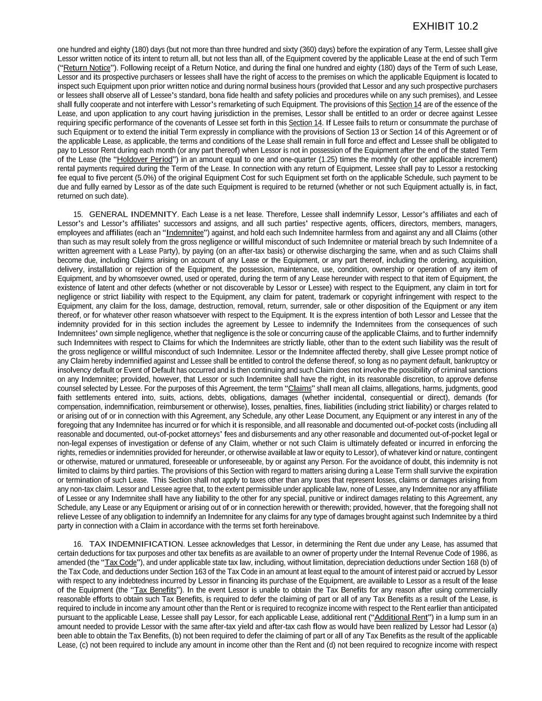 one hundred and eighty (180) days (but not more than three hundred and sixty (360) days) before the expiration of any Term, Lessee shall give Lessor written notice of its intent to return all, but not less than all, of the Equipment covered by the applicable Lease at the end of such Term (“Return Notice”). Following receipt of a Return Notice, and during the final one hundred and eighty (180) days of the Term of such Lease, Lessor and its prospective purchasers or lessees shall have the right of access to the premises on which the applicable Equipment is located to inspect such Equipment upon prior written notice and during normal business hours (provided that Lessor and any such prospective purchasers or lessees shall observe all of Lessee’s standard, bona fide health and safety policies and procedures while on any such premises), and Lessee shall fully cooperate and not interfere with Lessor’s remarketing of such Equipment. The provisions of this Section 14 are of the essence of the Lease, and upon application to any court having jurisdiction in the premises, Lessor shall be entitled to an order or decree against Lessee requiring specific performance of the covenants of Lessee set forth in this Section 14. If Lessee fails to return or consummate the purchase of such Equipment or to extend the initial Term expressly in compliance with the provisions of Section 13 or Section 14 of this Agreement or of the applicable Lease, as applicable, the terms and conditions of the Lease shall remain in full force and effect and Lessee shall be obligated to pay to Lessor Rent during each month (or any part thereof) when Lessor is not in possession of the Equipment after the end of the stated Term of the Lease (the “Holdover Period”) in an amount equal to one and one-quarter (1.25) times the monthly (or other applicable increment) rental payments required during the Term of the Lease. In connection with any return of Equipment, Lessee shall pay to Lessor a restocking fee equal to five percent (5.0%) of the original Equipment Cost for such Equipment set forth on the applicable Schedule, such payment to be due and fully earned by Lessor as of the date such Equipment is required to be returned (whether or not such Equipment actually is, in fact, returned on such date). 15. GENERAL INDEMNITY. Each Lease is a net lease. Therefore, Lessee shall indemnify Lessor, Lessor’s affiliates and each of Lessor’s and Lessor’s affiliates’ successors and assigns, and all such parties’ respective agents, officers, directors, members, managers, employees and affiliates (each an “Indemnitee”) against, and hold each such Indemnitee harmless from and against any and all Claims (other than such as may result solely from the gross negligence or willful misconduct of such Indemnitee or material breach by such Indemnitee of a written agreement with a Lease Party), by paying (on an after-tax basis) or otherwise discharging the same, when and as such Claims shall become due, including Claims arising on account of any Lease or the Equipment, or any part thereof, including the ordering, acquisition, delivery, installation or rejection of the Equipment, the possession, maintenance, use, condition, ownership or operation of any item of Equipment, and by whomsoever owned, used or operated, during the term of any Lease hereunder with respect to that item of Equipment, the existence of latent and other defects (whether or not discoverable by Lessor or Lessee) with respect to the Equipment, any claim in tort for negligence or strict liability with respect to the Equipment, any claim for patent, trademark or copyright infringement with respect to the Equipment, any claim for the loss, damage, destruction, removal, return, surrender, sale or other disposition of the Equipment or any item thereof, or for whatever other reason whatsoever with respect to the Equipment. It is the express intention of both Lessor and Lessee that the indemnity provided for in this section includes the agreement by Lessee to indemnify the Indemnitees from the consequences of such Indemnitees’ own simple negligence, whether that negligence is the sole or concurring cause of the applicable Claims, and to further indemnify such Indemnitees with respect to Claims for which the Indemnitees are strictly liable, other than to the extent such liability was the result of the gross negligence or willful misconduct of such Indemnitee. Lessor or the Indemnitee affected thereby, shall give Lessee prompt notice of any Claim hereby indemnified against and Lessee shall be entitled to control the defense thereof, so long as no payment default, bankruptcy or insolvency default or Event of Default has occurred and is then continuing and such Claim does not involve the possibility of criminal sanctions on any Indemnitee; provided, however, that Lessor or such Indemnitee shall have the right, in its reasonable discretion, to approve defense counsel selected by Lessee. For the purposes of this Agreement, the term “Claims” shall mean all claims, allegations, harms, judgments, good faith settlements entered into, suits, actions, debts, obligations, damages (whether incidental, consequential or direct), demands (for compensation, indemnification, reimbursement or otherwise), losses, penalties, fines, liabilities (including strict liability) or charges related to or arising out of or in connection with this Agreement, any Schedule, any other Lease Document, any Equipment or any interest in any of the foregoing that any Indemnitee has incurred or for which it is responsible, and all reasonable and documented out-of-pocket costs (including all reasonable and documented, out-of-pocket attorneys’ fees and disbursements and any other reasonable and documented out-of-pocket legal or non-legal expenses of investigation or defense of any Claim, whether or not such Claim is ultimately defeated or incurred in enforcing the rights, remedies or indemnities provided fo