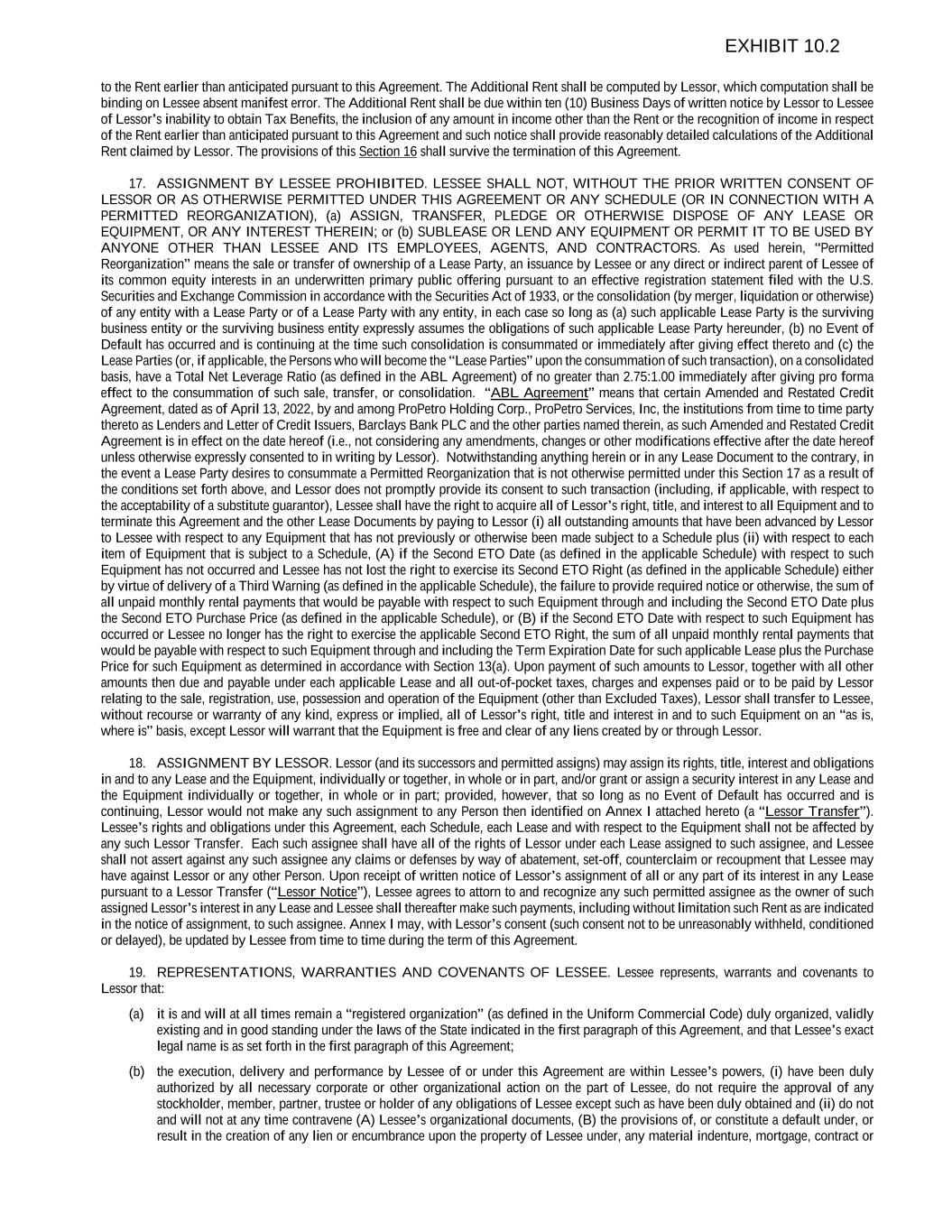 to the Rent earlier than anticipated pursuant to this Agreement. The Additional Rent shall be computed by Lessor, which computation shall be binding on Lessee absent manifest error. The Additional Rent shall be due within ten (10) Business Days of written notice by Lessor to Lessee of Lessor’s inability to obtain Tax Benefits, the inclusion of any amount in income other than the Rent or the recognition of income in respect of the Rent earlier than anticipated pursuant to this Agreement and such notice shall provide reasonably detailed calculations of the Additional Rent claimed by Lessor. The provisions of this Section 16 shall survive the termination of this Agreement. 17. ASSIGNMENT BY LESSEE PROHIBITED. LESSEE SHALL NOT, WITHOUT THE PRIOR WRITTEN CONSENT OF LESSOR OR AS OTHERWISE PERMITTED UNDER THIS AGREEMENT OR ANY SCHEDULE (OR IN CONNECTION WITH A PERMITTED REORGANIZATION), (a) ASSIGN, TRANSFER, PLEDGE OR OTHERWISE DISPOSE OF ANY LEASE OR EQUIPMENT, OR ANY INTEREST THEREIN; or (b) SUBLEASE OR LEND ANY EQUIPMENT OR PERMIT IT TO BE USED BY ANYONE OTHER THAN LESSEE AND ITS EMPLOYEES, AGENTS, AND CONTRACTORS. As used herein, “Permitted Reorganization” means the sale or transfer of ownership of a Lease Party, an issuance by Lessee or any direct or indirect parent of Lessee of its common equity interests in an underwritten primary public offering pursuant to an effective registration statement filed with the U.S. Securities and Exchange Commission in accordance with the Securities Act of 1933, or the consolidation (by merger, liquidation or otherwise) of any entity with a Lease Party or of a Lease Party with any entity, in each case so long as (a) such applicable Lease Party is the surviving business entity or the surviving business entity expressly assumes the obligations of such applicable Lease Party hereunder, (b) no Event of Default has occurred and is continuing at the time such consolidation is consummated or immediately after giving effect thereto and (c) the Lease Parties (or, if applicable, the Persons who will become the “Lease Parties” upon the consummation of such transaction), on a consolidated basis, have a Total Net Leverage Ratio (as defined in the ABL Agreement) of no greater than 2.75:1.00 immediately after giving pro forma effect to the consummation of such sale, transfer, or consolidation. “ABL Agreement” means that certain Amended and Restated Credit Agreement, dated as of April 13, 2022, by and among ProPetro Holding Corp., ProPetro Services, Inc, the institutions from time to time party thereto as Lenders and Letter of Credit Issuers, Barclays Bank PLC and the other parties named therein, as such Amended and Restated Credit Agreement is in effect on the date hereof (i.e., not considering any amendments, changes or other modifications effective after the date hereof unless otherwise expressly consented to in writing by Lessor). Notwithstanding anything herein or in any Lease Document to the contrary, in the event a Lease Party desires to consummate a Permitted Reorganization that is not otherwise permitted under this Section 17 as a result of the conditions set forth above, and Lessor does not promptly provide its consent to such transaction (including, if applicable, with respect to the acceptability of a substitute guarantor), Lessee shall have the right to acquire all of Lessor’s right, title, and interest to all Equipment and to terminate this Agreement and the other Lease Documents by paying to Lessor (i) all outstanding amounts that have been advanced by Lessor to Lessee with respect to any Equipment that has not previously or otherwise been made subject to a Schedule plus (ii) with respect to each item of Equipment that is subject to a Schedule, (A) if the Second ETO Date (as defined in the applicable Schedule) with respect to such Equipment has not occurred and Lessee has not lost the right to exercise its Second ETO Right (as defined in the applicable Schedule) either by virtue of delivery of a Third Warning (as defined in the applicable Schedule), the failure to provide required notice or otherwise, the sum of all unpaid monthly rental payments that would be payable with respect to such Equipment through and including the Second ETO Date plus the Second ETO Purchase Price (as defined in the applicable Schedule), or (B) if the Second ETO Date with respect to such Equipment has occurred or Lessee no longer has the right to exercise the applicable Second ETO Right, the sum of all unpaid monthly rental payments that would be payable with respect to such Equipment through and including the Term Expiration Date for such applicable Lease plus the Purchase Price for such Equipment as determined in accordance with Section 13(a). Upon payment of such amounts to Lessor, together with all other amounts then due and payable under each applicable Lease and all out-of-pocket taxes, charges and expenses paid or to be paid by Lessor relating to the sale, registration, use, possession and operation of the Equipment (other than Excluded Taxes), Lessor shall transfer to Lessee, without recourse or warranty of any kind, express or implied, all of Lessor’s right, title and interest in and to such Equipment on an “as is, where is” basis, except Lessor will warrant that the Equipment is free and clear of any liens created by or through Lessor. 18. ASSIGNMENT BY LESSOR. Lessor (and its successors and permitted assigns) may assign its rights, title, interest and obligations in and to any Lease and the Equipment, individually or together, in whole or in part, and/or grant or assign a security interest in any Lease and the Equipment individually or together, in whole or in part; provided, however, that so long as no Event of Default has occurred and is continuing, Lessor would not make any such assignment to any Person then identified on Annex I attached hereto (a “Lessor Transfer”). Lessee’s rights and obligations under this Agreement, each Schedule, eac