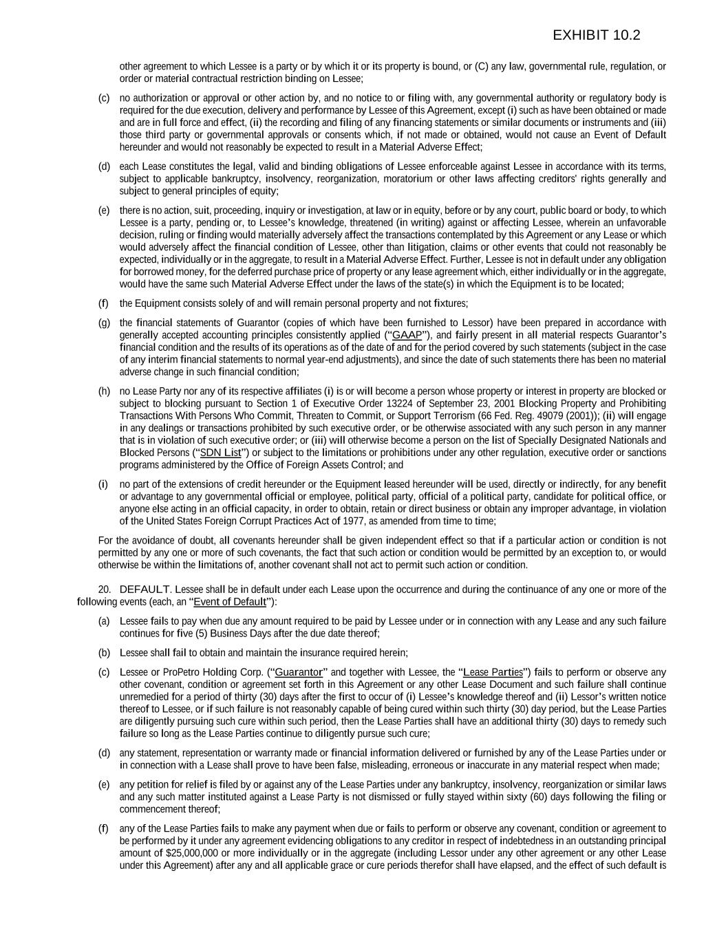 other agreement to which Lessee is a party or by which it or its property is bound, or (C) any law, governmental rule, regulation, or order or material contractual restriction binding on Lessee; (c) no authorization or approval or other action by, and no notice to or filing with, any governmental authority or regulatory body is required for the due execution, delivery and performance by Lessee of this Agreement, except (i) such as have been obtained or made and are in full force and effect, (ii) the recording and filing of any financing statements or similar documents or instruments and (iii) those third party or governmental approvals or consents which, if not made or obtained, would not cause an Event of Default hereunder and would not reasonably be expected to result in a Material Adverse Effect; (d) each Lease constitutes the legal, valid and binding obligations of Lessee enforceable against Lessee in accordance with its terms, subject to applicable bankruptcy, insolvency, reorganization, moratorium or other laws affecting creditors' rights generally and subject to general principles of equity; (e) there is no action, suit, proceeding, inquiry or investigation, at law or in equity, before or by any court, public board or body, to which Lessee is a party, pending or, to Lessee’s knowledge, threatened (in writing) against or affecting Lessee, wherein an unfavorable decision, ruling or finding would materially adversely affect the transactions contemplated by this Agreement or any Lease or which would adversely affect the financial condition of Lessee, other than litigation, claims or other events that could not reasonably be expected, individually or in the aggregate, to result in a Material Adverse Effect. Further, Lessee is not in default under any obligation for borrowed money, for the deferred purchase price of property or any lease agreement which, either individually or in the aggregate, would have the same such Material Adverse Effect under the laws of the state(s) in which the Equipment is to be located; (f) the Equipment consists solely of and will remain personal property and not fixtures; (g) the financial statements of Guarantor (copies of which have been furnished to Lessor) have been prepared in accordance with generally accepted accounting principles consistently applied (“GAAP”), and fairly present in all material respects Guarantor’s financial condition and the results of its operations as of the date of and for the period covered by such statements (subject in the case of any interim financial statements to normal year-end adjustments), and since the date of such statements there has been no material adverse change in such financial condition; (h) no Lease Party nor any of its respective affiliates (i) is or will become a person whose property or interest in property are blocked or subject to blocking pursuant to Section 1 of Executive Order 13224 of September 23, 2001 Blocking Property and Prohibiting Transactions With Persons Who Commit, Threaten to Commit, or Support Terrorism (66 Fed. Reg. 49079 (2001)); (ii) will engage in any dealings or transactions prohibited by such executive order, or be otherwise associated with any such person in any manner that is in violation of such executive order; or (iii) will otherwise become a person on the list of Specially Designated Nationals and Blocked Persons (“SDN List”) or subject to the limitations or prohibitions under any other regulation, executive order or sanctions programs administered by the Office of Foreign Assets Control; and (i) no part of the extensions of credit hereunder or the Equipment leased hereunder will be used, directly or indirectly, for any benefit or advantage to any governmental official or employee, political party, official of a political party, candidate for political office, or anyone else acting in an official capacity, in order to obtain, retain or direct business or obtain any improper advantage, in violation of the United States Foreign Corrupt Practices Act of 1977, as amended from time to time; For the avoidance of doubt, all covenants hereunder shall be given independent effect so that if a particular action or condition is not permitted by any one or more of such covenants, the fact that such action or condition would be permitted by an exception to, or would otherwise be within the limitations of, another covenant shall not act to permit such action or condition. 20. DEFAULT. Lessee shall be in default under each Lease upon the occurrence and during the continuance of any one or more of the following events (each, an “Event of Default”): (a) Lessee fails to pay when due any amount required to be paid by Lessee under or in connection with any Lease and any such failure continues for five (5) Business Days after the due date thereof; (b) Lessee shall fail to obtain and maintain the insurance required herein; (c) Lessee or ProPetro Holding Corp. (“Guarantor” and together with Lessee, the “Lease Parties”) fails to perform or observe any other covenant, condition or agreement set forth in this Agreement or any other Lease Document and such failure shall continue unremedied for a period of thirty (30) days after the first to occur of (i) Lessee’s knowledge thereof and (ii) Lessor’s written notice thereof to Lessee, or if such failure is not reasonably capable of being cured within such thirty (30) day period, but the Lease Parties are diligently pursuing such cure within such period, then the Lease Parties shall have an additional thirty (30) days to remedy such failure so long as the Lease Parties continue to diligently pursue such cure; (d) any statement, representation or warranty made or financial information delivered or furnished by any of the Lease Parties under or in connection with a Lease shall prove to have been false, misleading, erroneous or inaccurate in any material respect when made; (e) any petition for relief is filed by or against any of the Lea