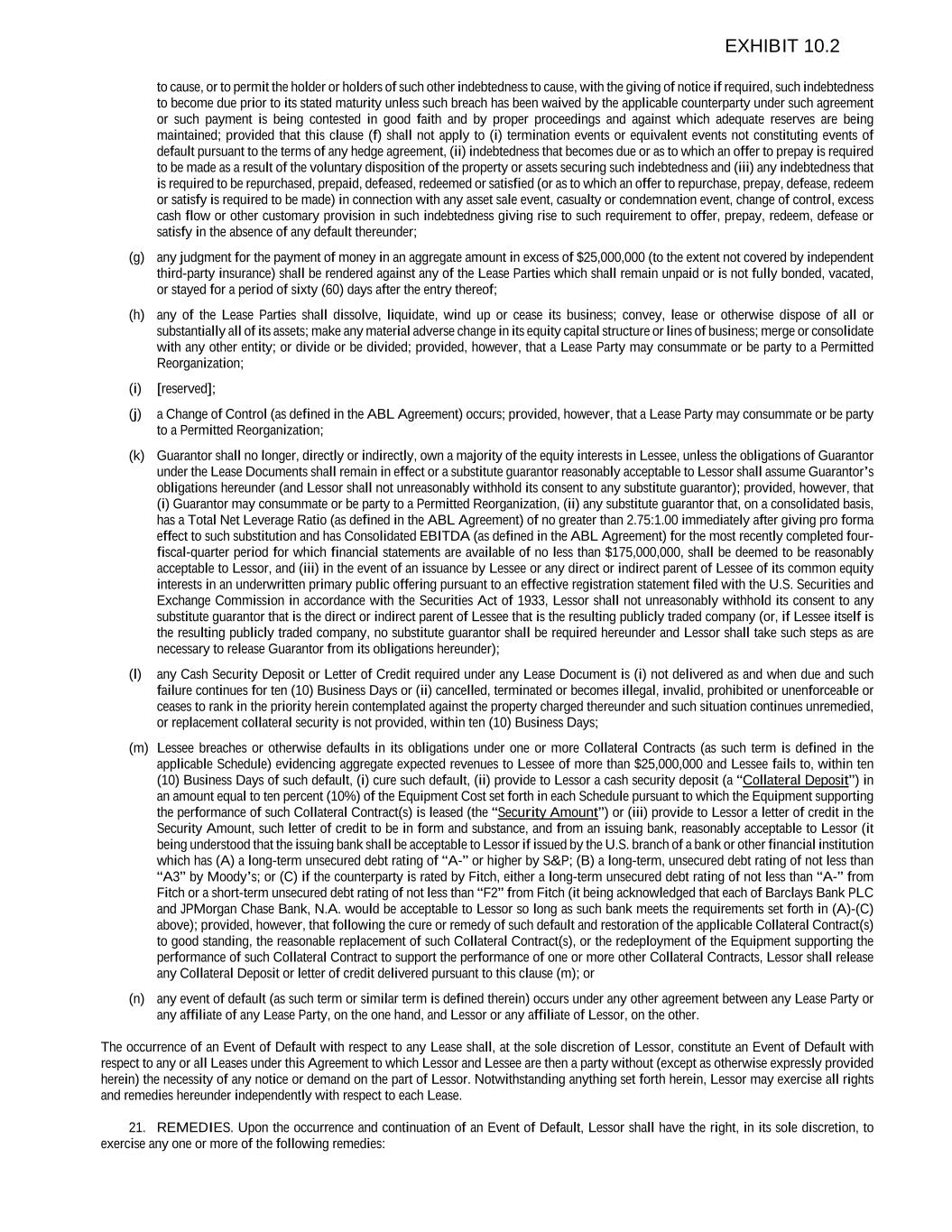 to cause, or to permit the holder or holders of such other indebtedness to cause, with the giving of notice if required, such indebtedness to become due prior to its stated maturity unless such breach has been waived by the applicable counterparty under such agreement or such payment is being contested in good faith and by proper proceedings and against which adequate reserves are being maintained; provided that this clause (f) shall not apply to (i) termination events or equivalent events not constituting events of default pursuant to the terms of any hedge agreement, (ii) indebtedness that becomes due or as to which an offer to prepay is required to be made as a result of the voluntary disposition of the property or assets securing such indebtedness and (iii) any indebtedness that is required to be repurchased, prepaid, defeased, redeemed or satisfied (or as to which an offer to repurchase, prepay, defease, redeem or satisfy is required to be made) in connection with any asset sale event, casualty or condemnation event, change of control, excess cash flow or other customary provision in such indebtedness giving rise to such requirement to offer, prepay, redeem, defease or satisfy in the absence of any default thereunder; (g) any judgment for the payment of money in an aggregate amount in excess of $25,000,000 (to the extent not covered by independent third-party insurance) shall be rendered against any of the Lease Parties which shall remain unpaid or is not fully bonded, vacated, or stayed for a period of sixty (60) days after the entry thereof; (h) any of the Lease Parties shall dissolve, liquidate, wind up or cease its business; convey, lease or otherwise dispose of all or substantially all of its assets; make any material adverse change in its equity capital structure or lines of business; merge or consolidate with any other entity; or divide or be divided; provided, however, that a Lease Party may consummate or be party to a Permitted Reorganization; (i) [reserved]; (j) a Change of Control (as defined in the ABL Agreement) occurs; provided, however, that a Lease Party may consummate or be party to a Permitted Reorganization; (k) Guarantor shall no longer, directly or indirectly, own a majority of the equity interests in Lessee, unless the obligations of Guarantor under the Lease Documents shall remain in effect or a substitute guarantor reasonably acceptable to Lessor shall assume Guarantor’s obligations hereunder (and Lessor shall not unreasonably withhold its consent to any substitute guarantor); provided, however, that (i) Guarantor may consummate or be party to a Permitted Reorganization, (ii) any substitute guarantor that, on a consolidated basis, has a Total Net Leverage Ratio (as defined in the ABL Agreement) of no greater than 2.75:1.00 immediately after giving pro forma effect to such substitution and has Consolidated EBITDA (as defined in the ABL Agreement) for the most recently completed four- fiscal-quarter period for which financial statements are available of no less than $175,000,000, shall be deemed to be reasonably acceptable to Lessor, and (iii) in the event of an issuance by Lessee or any direct or indirect parent of Lessee of its common equity interests in an underwritten primary public offering pursuant to an effective registration statement filed with the U.S. Securities and Exchange Commission in accordance with the Securities Act of 1933, Lessor shall not unreasonably withhold its consent to any substitute guarantor that is the direct or indirect parent of Lessee that is the resulting publicly traded company (or, if Lessee itself is the resulting publicly traded company, no substitute guarantor shall be required hereunder and Lessor shall take such steps as are necessary to release Guarantor from its obligations hereunder); (l) any Cash Security Deposit or Letter of Credit required under any Lease Document is (i) not delivered as and when due and such failure continues for ten (10) Business Days or (ii) cancelled, terminated or becomes illegal, invalid, prohibited or unenforceable or ceases to rank in the priority herein contemplated against the property charged thereunder and such situation continues unremedied, or replacement collateral security is not provided, within ten (10) Business Days; (m) Lessee breaches or otherwise defaults in its obligations under one or more Collateral Contracts (as such term is defined in the applicable Schedule) evidencing aggregate expected revenues to Lessee of more than $25,000,000 and Lessee fails to, within ten (10) Business Days of such default, (i) cure such default, (ii) provide to Lessor a cash security deposit (a “Collateral Deposit”) in an amount equal to ten percent (10%) of the Equipment Cost set forth in each Schedule pursuant to which the Equipment supporting the performance of such Collateral Contract(s) is leased (the “Security Amount”) or (iii) provide to Lessor a letter of credit in the Security Amount, such letter of credit to be in form and substance, and from an issuing bank, reasonably acceptable to Lessor (it being understood that the issuing bank shall be acceptable to Lessor if issued by the U.S. branch of a bank or other financial institution which has (A) a long-term unsecured debt rating of “A-” or higher by S&P; (B) a long-term, unsecured debt rating of not less than “A3” by Moody’s; or (C) if the counterparty is rated by Fitch, either a long-term unsecured debt rating of not less than “A-” from Fitch or a short-term unsecured debt rating of not less than “F2” from Fitch (it being acknowledged that each of Barclays Bank PLC and JPMorgan Chase Bank, N.A. would be acceptable to Lessor so long as such bank meets the requirements set forth in (A)-(C) above); provided, however, that following the cure or remedy of such default and restoration of the applicable Collateral Contract(s) to good standing, the reasonable replacement of such Collateral Contract(s), or the redeplo