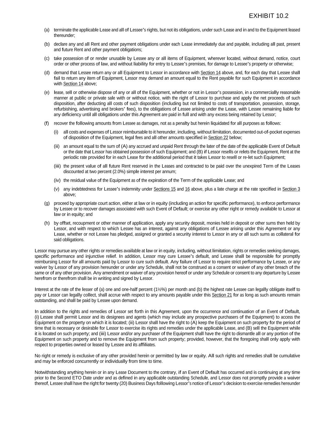 (a) terminate the applicable Lease and all of Lessee’s rights, but not its obligations, under such Lease and in and to the Equipment leased thereunder; (b) declare any and all Rent and other payment obligations under each Lease immediately due and payable, including all past, present and future Rent and other payment obligations; (c) take possession of or render unusable by Lessee any or all items of Equipment, wherever located, without demand, notice, court order or other process of law, and without liability for entry to Lessee’s premises, for damage to Lessee’s property or otherwise; (d) demand that Lessee return any or all Equipment to Lessor in accordance with Section 14 above, and, for each day that Lessee shall fail to return any item of Equipment, Lessor may demand an amount equal to the Rent payable for such Equipment in accordance with Section 14 above; (e) lease, sell or otherwise dispose of any or all of the Equipment, whether or not in Lessor’s possession, in a commercially reasonable manner at public or private sale with or without notice, with the right of Lessor to purchase and apply the net proceeds of such disposition, after deducting all costs of such disposition (including but not limited to costs of transportation, possession, storage, refurbishing, advertising and brokers’ fees), to the obligations of Lessee arising under the Lease, with Lessee remaining liable for any deficiency until all obligations under this Agreement are paid in full and with any excess being retained by Lessor; (f) recover the following amounts from Lessee as damages, not as a penalty but herein liquidated for all purposes as follows: (i) all costs and expenses of Lessor reimbursable to it hereunder, including, without limitation, documented out-of-pocket expenses of disposition of the Equipment, legal fees and all other amounts specified in Section 22 below; (ii) an amount equal to the sum of (A) any accrued and unpaid Rent through the later of the date of the applicable Event of Default or the date that Lessor has obtained possession of such Equipment; and (B) if Lessor resells or relets the Equipment, Rent at the periodic rate provided for in each Lease for the additional period that it takes Lessor to resell or re-let such Equipment; (iii) the present value of all future Rent reserved in the Leases and contracted to be paid over the unexpired Term of the Leases discounted at two percent (2.0%) simple interest per annum; (iv) the residual value of the Equipment as of the expiration of the Term of the applicable Lease; and (v) any indebtedness for Lessee’s indemnity under Sections 15 and 16 above, plus a late charge at the rate specified in Section 3 above; (g) proceed by appropriate court action, either at law or in equity (including an action for specific performance), to enforce performance by Lessee or to recover damages associated with such Event of Default; or exercise any other right or remedy available to Lessor at law or in equity; and (h) by offset, recoupment or other manner of application, apply any security deposit, monies held in deposit or other sums then held by Lessor, and with respect to which Lessee has an interest, against any obligations of Lessee arising under this Agreement or any Lease, whether or not Lessee has pledged, assigned or granted a security interest to Lessor in any or all such sums as collateral for said obligations. Lessor may pursue any other rights or remedies available at law or in equity, including, without limitation, rights or remedies seeking damages, specific performance and injunctive relief. In addition, Lessor may cure Lessee’s default, and Lessee shall be responsible for promptly reimbursing Lessor for all amounts paid by Lessor to cure such default. Any failure of Lessor to require strict performance by Lessee, or any waiver by Lessor of any provision hereunder or under any Schedule, shall not be construed as a consent or waiver of any other breach of the same or of any other provision. Any amendment or waiver of any provision hereof or under any Schedule or consent to any departure by Lessee herefrom or therefrom shall be in writing and signed by Lessor. Interest at the rate of the lesser of (a) one and one-half percent (1½%) per month and (b) the highest rate Lessee can legally obligate itself to pay or Lessor can legally collect, shall accrue with respect to any amounts payable under this Section 21 for as long as such amounts remain outstanding, and shall be paid by Lessee upon demand. In addition to the rights and remedies of Lessor set forth in this Agreement, upon the occurrence and continuation of an Event of Default, (i) Lessee shall permit Lessor and its designees and agents (which may include any prospective purchasers of the Equipment) to access the Equipment on the property on which it is located; (ii) Lessor shall have the right to (A) keep the Equipment on such property for the period of time that is necessary or desirable for Lessor to exercise its rights and remedies under the applicable Lease, and (B) sell the Equipment while it is located on such property; and (iii) Lessor and/or any purchaser of the Equipment shall have the right to dismantle all or any portion of the Equipment on such property and to remove the Equipment from such property; provided, however, that the foregoing shall only apply with respect to properties owned or leased by Lessee and its affiliates. No right or remedy is exclusive of any other provided herein or permitted by law or equity. All such rights and remedies shall be cumulative and may be enforced concurrently or individually from time to time. Notwithstanding anything herein or in any Lease Document to the contrary, if an Event of Default has occurred and is continuing at any time prior to the Second ETO Date under and as defined in any applicable outstanding Schedule, and Lessor does not promptly provide a waiver thereof, Lessee shall have the right for twenty (20) Business Days