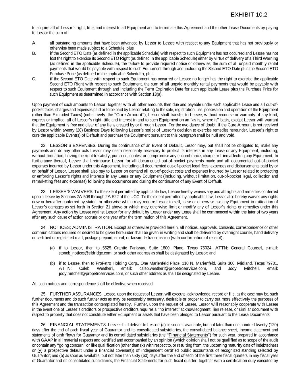 to acquire all of Lessor’s right, title, and interest to all Equipment and to terminate this Agreement and the other Lease Documents by paying to Lessor the sum of: A. all outstanding amounts that have been advanced by Lessor to Lessee with respect to any Equipment that has not previously or otherwise been made subject to a Schedule, plus B. if the Second ETO Date (as defined in the applicable Schedule) with respect to such Equipment has not occurred and Lessee has not lost the right to exercise its Second ETO Right (as defined in the applicable Schedule) either by virtue of delivery of a Third Warning (as defined in the applicable Schedule), the failure to provide required notice or otherwise, the sum of all unpaid monthly rental payments that would be payable with respect to such Equipment through and including the Second ETO Date plus the Second ETO Purchase Price (as defined in the applicable Schedule), plus C. if the Second ETO Date with respect to such Equipment has occurred or Lessee no longer has the right to exercise the applicable Second ETO Right with respect to such Equipment, the sum of all unpaid monthly rental payments that would be payable with respect to such Equipment through and including the Term Expiration Date for such applicable Lease plus the Purchase Price for such Equipment as determined in accordance with Section 13(a). Upon payment of such amounts to Lessor, together with all other amounts then due and payable under each applicable Lease and all out-of- pocket taxes, charges and expenses paid or to be paid by Lessor relating to the sale, registration, use, possession and operation of the Equipment (other than Excluded Taxes) (collectively, the “Cure Amount”), Lessor shall transfer to Lessee, without recourse or warranty of any kind, express or implied, all of Lessor’s right, title and interest in and to such Equipment on an “as is, where is” basis, except Lessor will warrant that the Equipment is free and clear of any liens created by or through Lessor. For the avoidance of doubt, if the Cure Amount is not received by Lessor within twenty (20) Business Days following Lessor’s notice of Lessor’s decision to exercise remedies hereunder, Lessee’s right to cure the applicable Event(s) of Default and purchase the Equipment pursuant to this paragraph shall be null and void. 22. LESSOR’S EXPENSES. During the continuance of an Event of Default, Lessor may, but shall not be obligated to, make any payments and do any other acts Lessor may deem reasonably necessary to protect its interests in any Lease or any Equipment, including, without limitation, having the right to satisfy, purchase, contest or compromise any encumbrance, charge or Lien affecting any Equipment. In furtherance thereof, Lessee shall reimburse Lessor for all documented out-of-pocket payments made and all documented out-of-pocket expenses incurred by Lessor under this Agreement, including all documented out-of-pocket legal fees, expenses and disbursements paid by or on behalf of Lessor. Lessee shall also pay to Lessor on demand all out-of-pocket costs and expenses incurred by Lessor related to protecting or enforcing Lessor’s rights and interests in any Lease or any Equipment (including, without limitation, out-of-pocket legal, collection and remarketing fees and expenses) following the occurrence and during the continuance of any Event of Default. 23. LESSEE’S WAIVERS. To the extent permitted by applicable law, Lessee hereby waives any and all rights and remedies conferred upon a lessee by Sections 2A-508 through 2A-522 of the UCC. To the extent permitted by applicable law, Lessee also hereby waives any rights now or hereafter conferred by statute or otherwise which may require Lessor to sell, lease or otherwise use any Equipment in mitigation of Lessor’s damages as set forth in Section 21 above or which may otherwise limit or modify any of Lessor’s rights or remedies under this Agreement. Any action by Lessee against Lessor for any default by Lessor under any Lease shall be commenced within the later of two years after any such cause of action accrues or one year after the termination of this Agreement. 24. NOTICES; ADMINISTRATION. Except as otherwise provided herein, all notices, approvals, consents, correspondence or other communications required or desired to be given hereunder shall be given in writing and shall be delivered by overnight courier, hand delivery or certified or registered mail, postage prepaid, email, or facsimile transmission (with confirmation of receipt): (a) if to Lessor, then to 5525 Granite Parkway, Suite 1800, Plano, Texas 75024, ATTN: General Counsel, e-mail: stoneb_notices@eldridge.com, or such other address as shall be designated by Lessor; and (b) if to Lessee, then to ProPetro Holding Corp., One Marienfeld Place, 110 N. Marienfeld, Suite 300, Midland, Texas 79701, ATTN: Caleb Weatherl, email: caleb.weatherl@propetroservices.com, and Jody Mitchell, email: jody.mitchell@propetroservices.com, or such other address as shall be designated by Lessee. All such notices and correspondence shall be effective when received. 25. FURTHER ASSURANCES. Lessee, upon the request of Lessor, will execute, acknowledge, record or file, as the case may be, such further documents and do such further acts as may be reasonably necessary, desirable or proper to carry out more effectively the purposes of this Agreement and the transaction contemplated hereby. Further, upon the request of Lessee, Lessor will reasonably cooperate with Lessee in the event one of Lessee’s creditors or prospective creditors requires a “no interest” acknowledgment, lien release, or similar document with respect to property that does not constitute either Equipment or assets that have been pledged to Lessor pursuant to the Lease Documents. 26. FINANCIAL STATEMENTS. Lessee shall deliver to Lessor: (a) as soon as available, but not later than one hundred twenty (120) days after the end of e