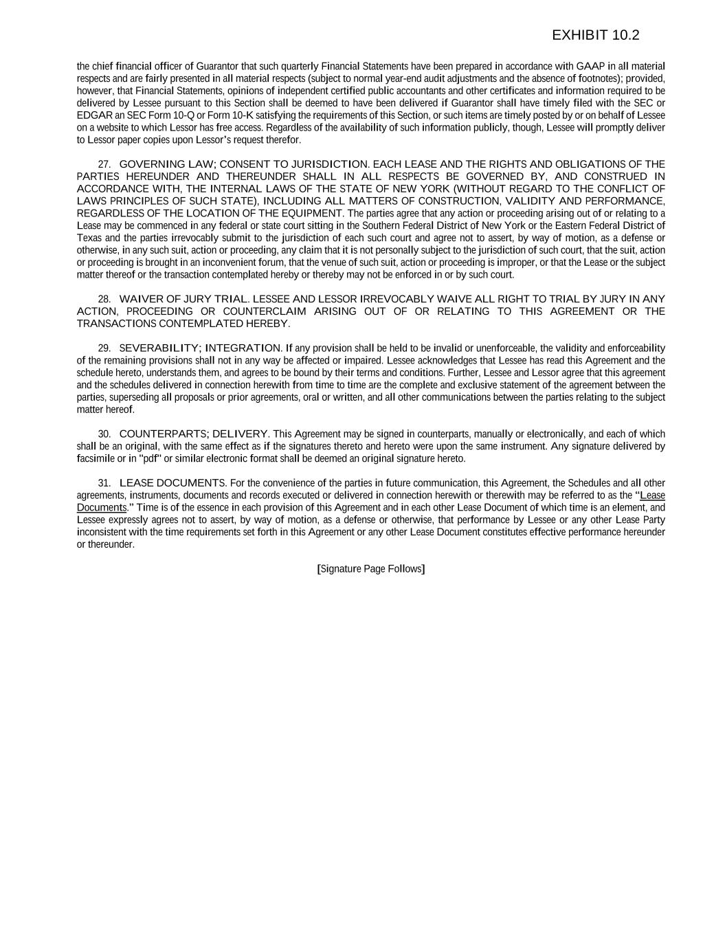 the chief financial officer of Guarantor that such quarterly Financial Statements have been prepared in accordance with GAAP in all material respects and are fairly presented in all material respects (subject to normal year-end audit adjustments and the absence of footnotes); provided, however, that Financial Statements, opinions of independent certified public accountants and other certificates and information required to be delivered by Lessee pursuant to this Section shall be deemed to have been delivered if Guarantor shall have timely filed with the SEC or EDGAR an SEC Form 10-Q or Form 10-K satisfying the requirements of this Section, or such items are timely posted by or on behalf of Lessee on a website to which Lessor has free access. Regardless of the availability of such information publicly, though, Lessee will promptly deliver to Lessor paper copies upon Lessor’s request therefor. 27. GOVERNING LAW; CONSENT TO JURISDICTION. EACH LEASE AND THE RIGHTS AND OBLIGATIONS OF THE PARTIES HEREUNDER AND THEREUNDER SHALL IN ALL RESPECTS BE GOVERNED BY, AND CONSTRUED IN ACCORDANCE WITH, THE INTERNAL LAWS OF THE STATE OF NEW YORK (WITHOUT REGARD TO THE CONFLICT OF LAWS PRINCIPLES OF SUCH STATE), INCLUDING ALL MATTERS OF CONSTRUCTION, VALIDITY AND PERFORMANCE, REGARDLESS OF THE LOCATION OF THE EQUIPMENT. The parties agree that any action or proceeding arising out of or relating to a Lease may be commenced in any federal or state court sitting in the Southern Federal District of New York or the Eastern Federal District of Texas and the parties irrevocably submit to the jurisdiction of each such court and agree not to assert, by way of motion, as a defense or otherwise, in any such suit, action or proceeding, any claim that it is not personally subject to the jurisdiction of such court, that the suit, action or proceeding is brought in an inconvenient forum, that the venue of such suit, action or proceeding is improper, or that the Lease or the subject matter thereof or the transaction contemplated hereby or thereby may not be enforced in or by such court. 28. WAIVER OF JURY TRIAL. LESSEE AND LESSOR IRREVOCABLY WAIVE ALL RIGHT TO TRIAL BY JURY IN ANY ACTION, PROCEEDING OR COUNTERCLAIM ARISING OUT OF OR RELATING TO THIS AGREEMENT OR THE TRANSACTIONS CONTEMPLATED HEREBY. 29. SEVERABILITY; INTEGRATION. If any provision shall be held to be invalid or unenforceable, the validity and enforceability of the remaining provisions shall not in any way be affected or impaired. Lessee acknowledges that Lessee has read this Agreement and the schedule hereto, understands them, and agrees to be bound by their terms and conditions. Further, Lessee and Lessor agree that this agreement and the schedules delivered in connection herewith from time to time are the complete and exclusive statement of the agreement between the parties, superseding all proposals or prior agreements, oral or written, and all other communications between the parties relating to the subject matter hereof. 30. COUNTERPARTS; DELIVERY. This Agreement may be signed in counterparts, manually or electronically, and each of which shall be an original, with the same effect as if the signatures thereto and hereto were upon the same instrument. Any signature delivered by facsimile or in "pdf" or similar electronic format shall be deemed an original signature hereto. 31. LEASE DOCUMENTS. For the convenience of the parties in future communication, this Agreement, the Schedules and all other agreements, instruments, documents and records executed or delivered in connection herewith or therewith may be referred to as the “Lease Documents.” Time is of the essence in each provision of this Agreement and in each other Lease Document of which time is an element, and Lessee expressly agrees not to assert, by way of motion, as a defense or otherwise, that performance by Lessee or any other Lease Party inconsistent with the time requirements set forth in this Agreement or any other Lease Document constitutes effective performance hereunder or thereunder. [Signature Page Follows] EXHIBIT 10.2