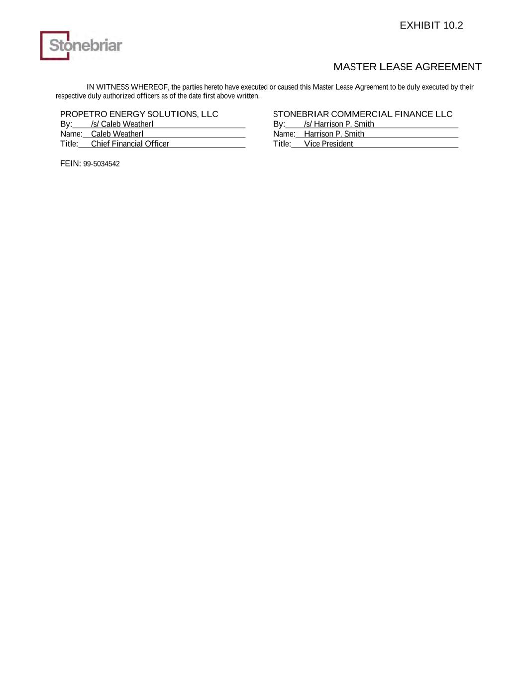 MASTER LEASE AGREEMENT IN WITNESS WHEREOF, the parties hereto have executed or caused this Master Lease Agreement to be duly executed by their respective duly authorized officers as of the date first above written. PROPETRO ENERGY SOLUTIONS, LLC By: /s/ Caleb Weatherl Name: Caleb Weatherl Title: Chief Financial Officer FEIN: 99-5034542 STONEBRIAR COMMERCIAL FINANCE LLC By: /s/ Harrison P. Smith Name: Harrison P. Smith Title: Vice President EXHIBIT 10.2